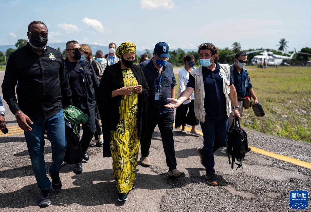 8月20日,联合国常务副秘书长阿明娜·穆罕默德(前排中)抵达海地莱凯的安托万-西蒙机场。