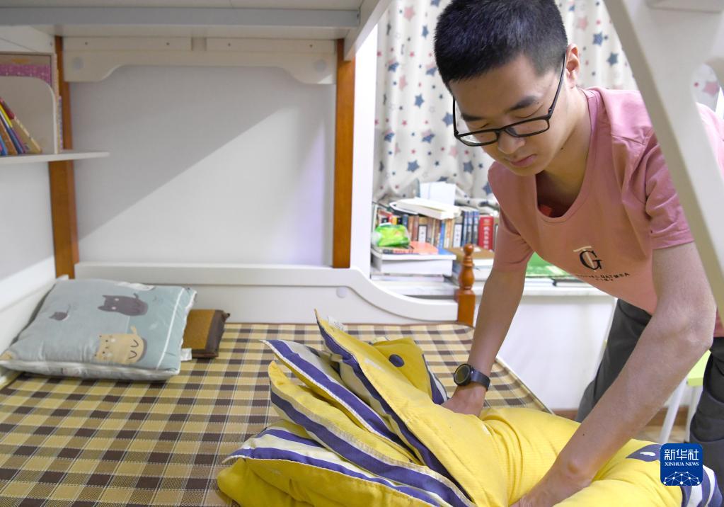 郑宇宸在家中练习叠被子(8月18日摄)。新华社记者 周华 摄