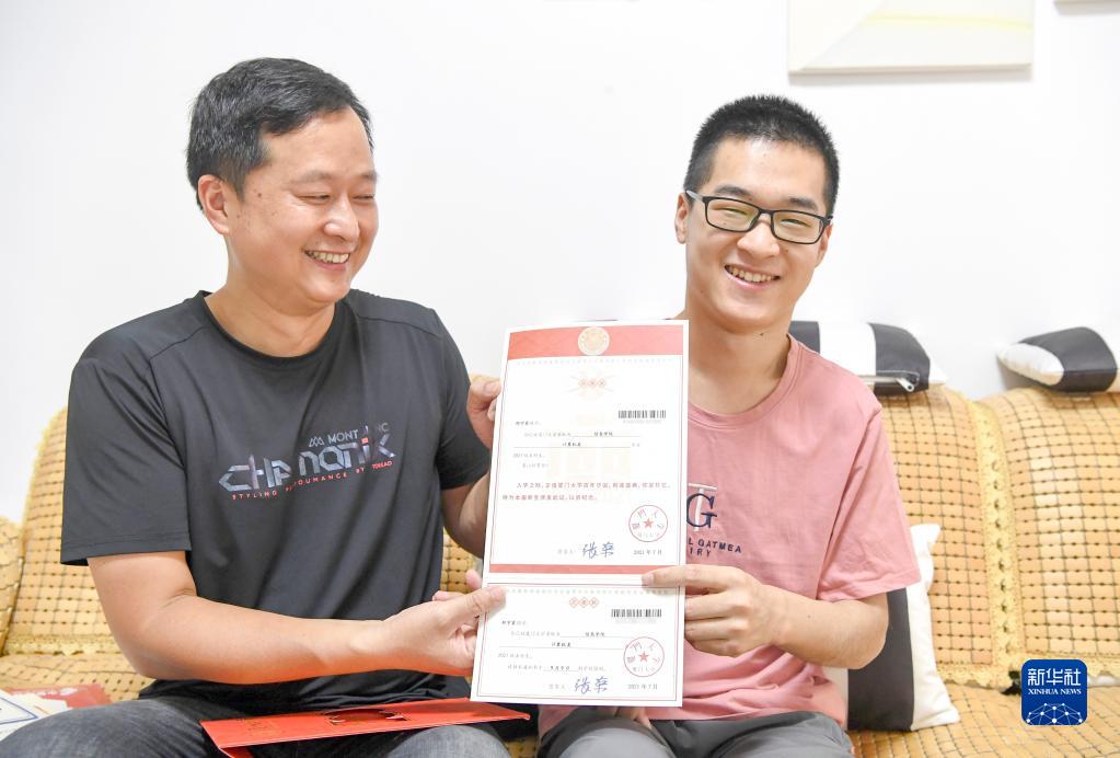 郑宇宸(右)和父亲在家里展示厦门大学的录取通知书(8月18日摄)。新华社记者 周华 摄