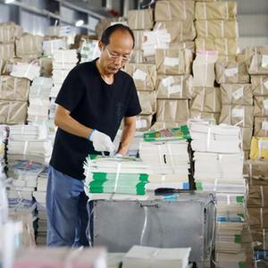 8月21日,在安徽省淮北市新华书店教材仓库内,工作人员在分类整理新学期教材。