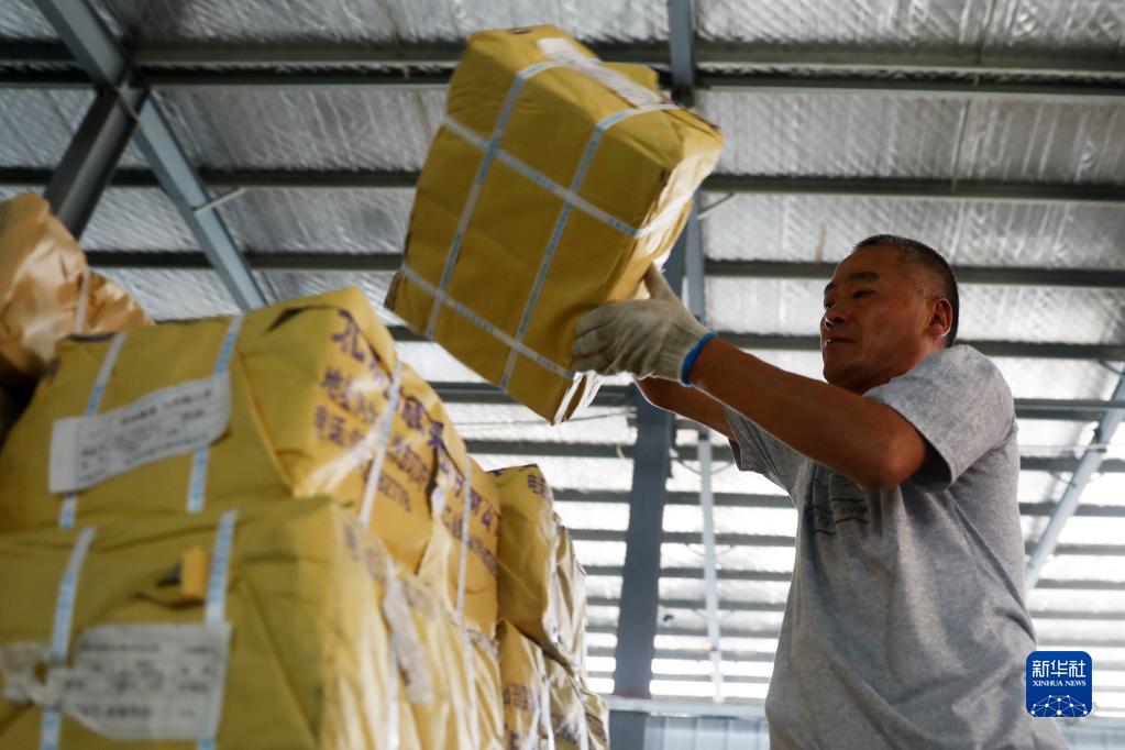 8月21日,在安徽省淮北市新华书店教材仓库内,工作人员在搬运新学期教材。