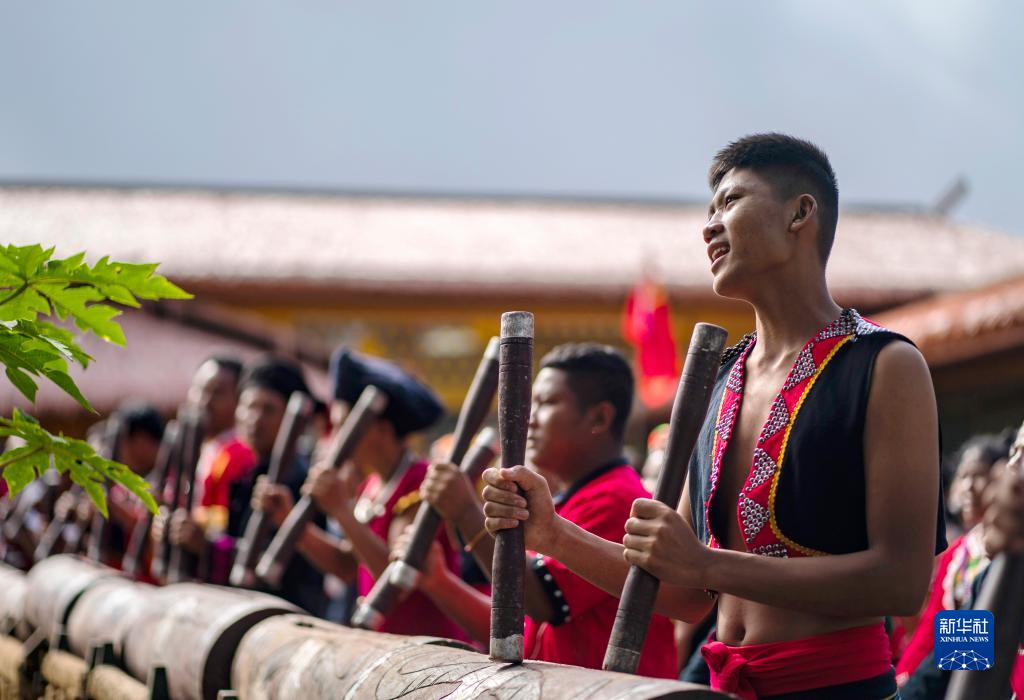 8月20日,云南省沧源县班洪乡班洪村的佤族群众身穿节日盛装,敲响佤族木鼓。新华社记者 江文耀 摄