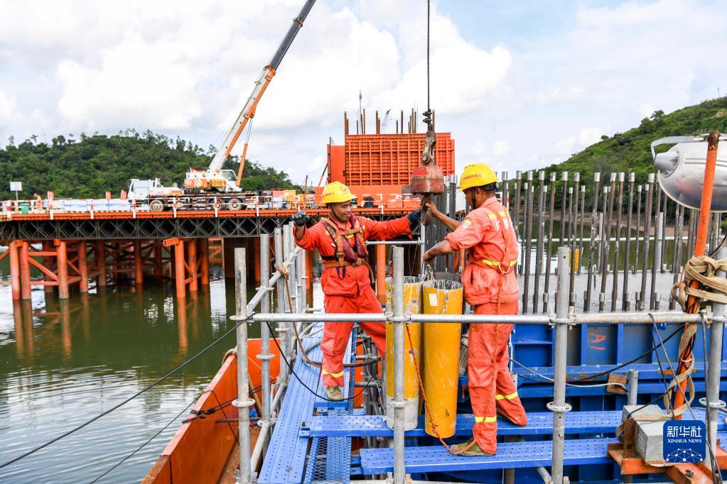8月21日,在广西钦州市龙门大桥项目建设现场,工人在进行海上吊装混凝土导料筒作业。