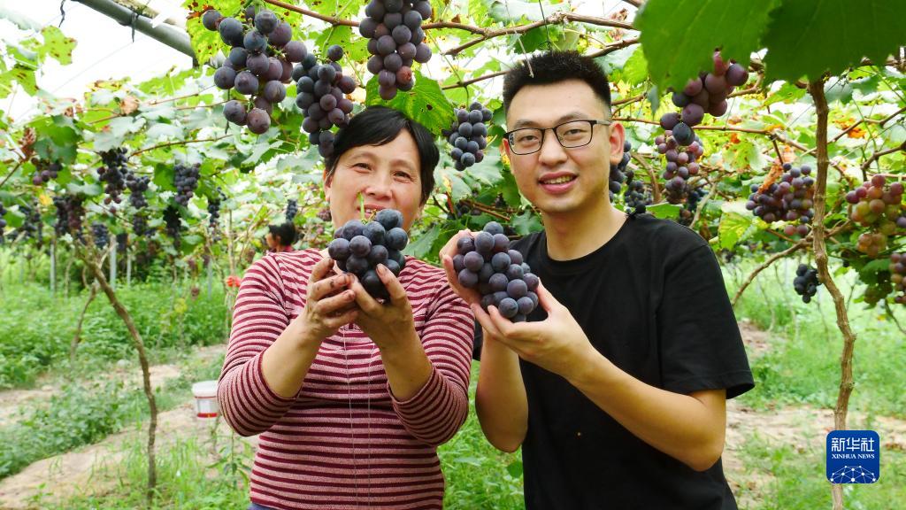 8月17日,在福建宁德市寿宁县下党乡,返乡创业青年陈上友(右)在葡萄园和果农合影。