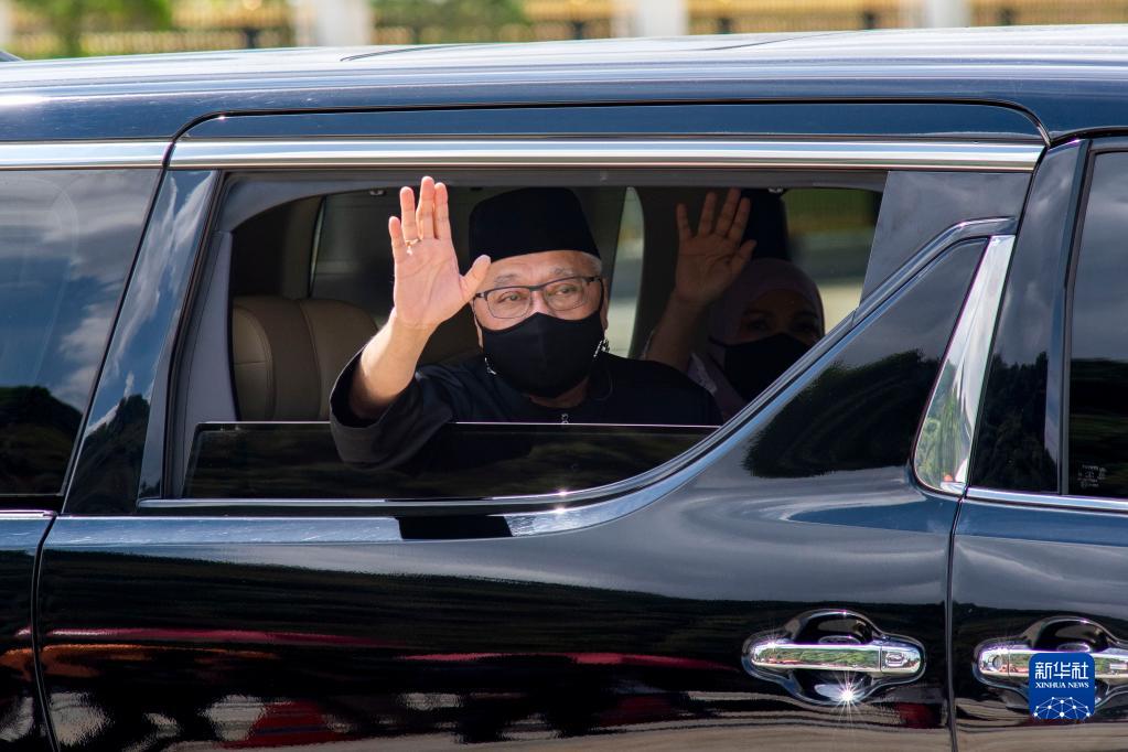 8月21日,在马来西亚吉隆坡,马来西亚总理伊斯梅尔·萨布里在就职仪式后离开国家皇宫时向媒体致意。