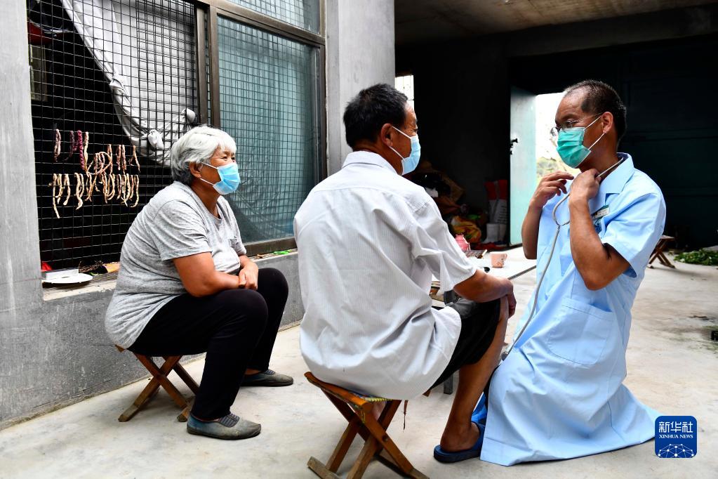 在日照市东港区三庄镇西王家村,乡村医生王远平为了方便诊断检查,跪在地上给村民测量血压(8月15日摄)。