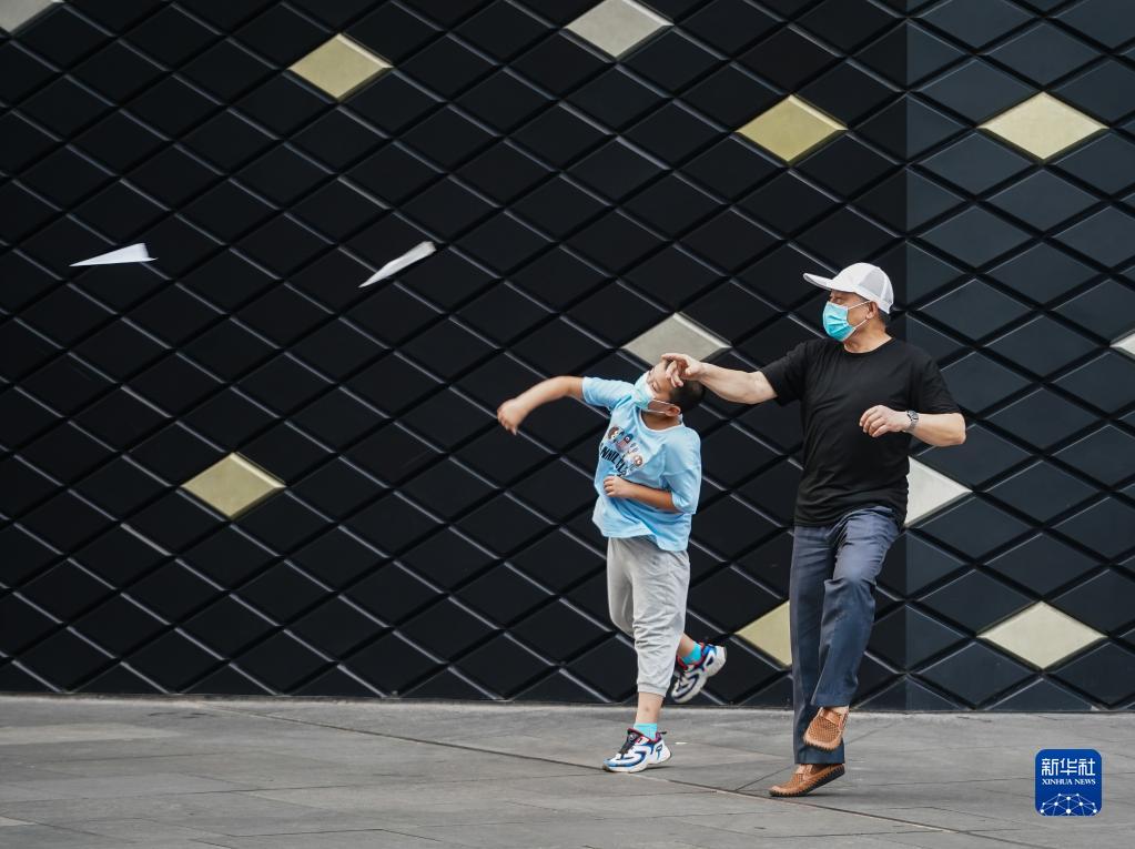 8月19日,市民在南京市一处广场玩纸飞机。
