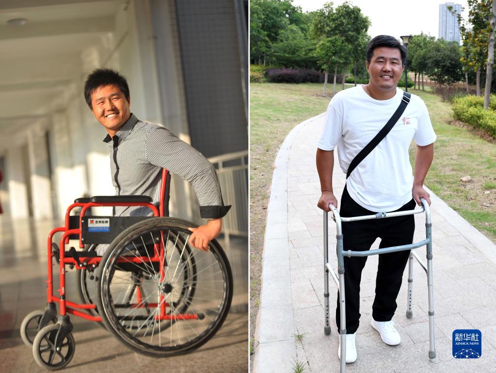 这是一张拼版照片,左图为:2011年10月31日,王雷在安徽医科大学校园里(新华社发 马杨摄);右图为:2021年8月15日,王雷在濉溪县的一个公园里散步(新华社记者刘军喜摄)。