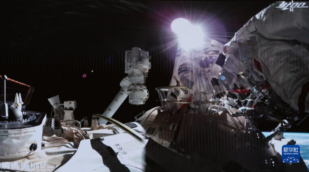 8月20日在北京航天飞行控制中心大屏拍摄的神舟十二号乘组航天员聂海胜、刘伯明同时在舱外操作的场景。