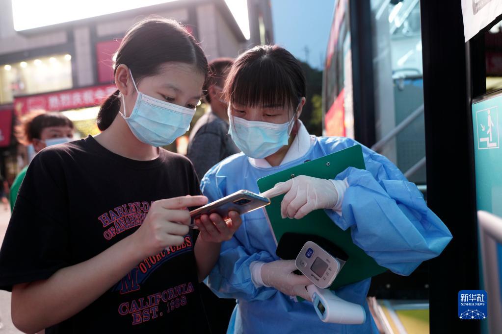 8月20日晚,在重庆市嘉陵风情步行街流动疫苗接种服务车前,医务人员在指导市民填写疫苗接种相关信息。