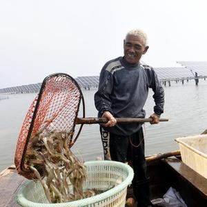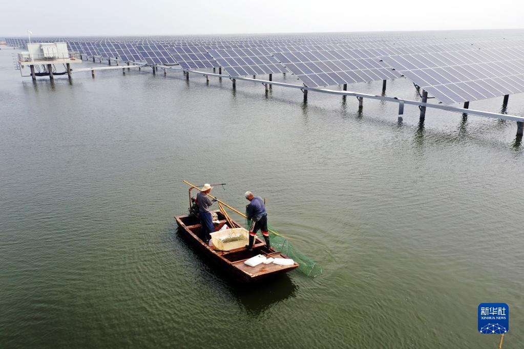 当地“渔光一体”产业园在虾池上建设光伏电站,既能发电,又能为虾池遮光,提升了水产养殖效益。