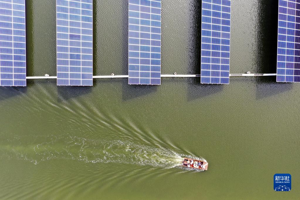 当地“渔光一体”产业园在虾池上建设光伏电站,既能发电,又能为虾池遮光,提升了水产养殖效益。