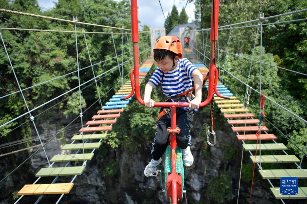 8月21日,游客在宣恩县锣圈岩天坑体验高空自行车。