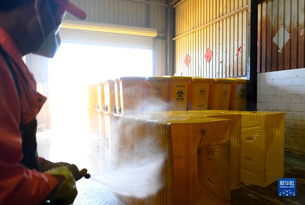 8月21日,在郑州市医疗废物集中处置中心,工作人员对医疗废物周转箱进行清洗消毒。