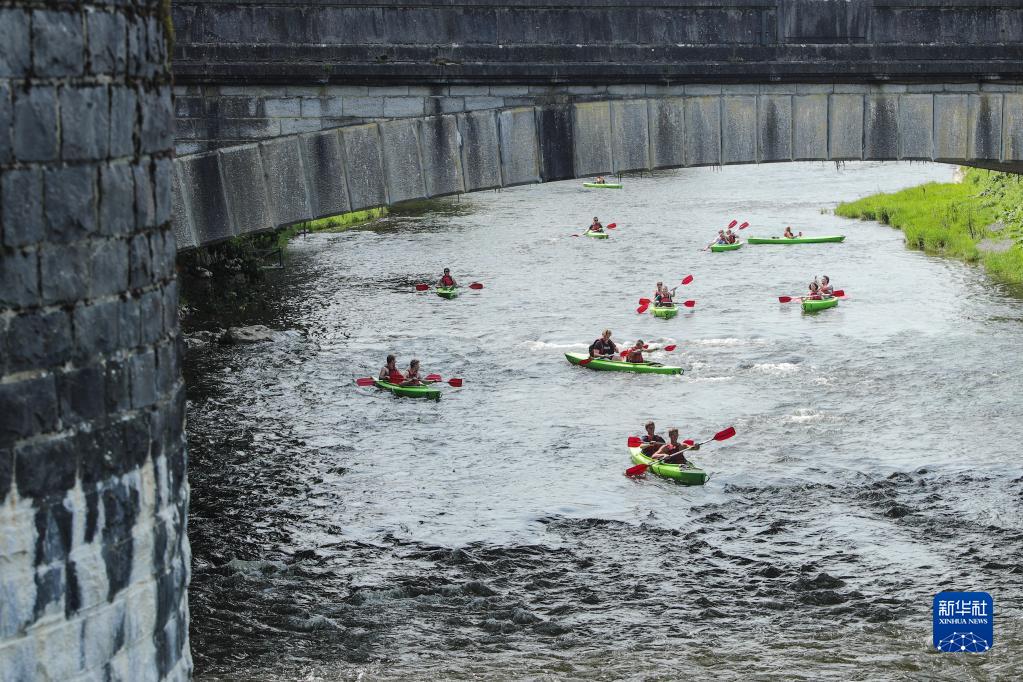 8月21日,游客在比利时小城迪尔比体验皮划艇。