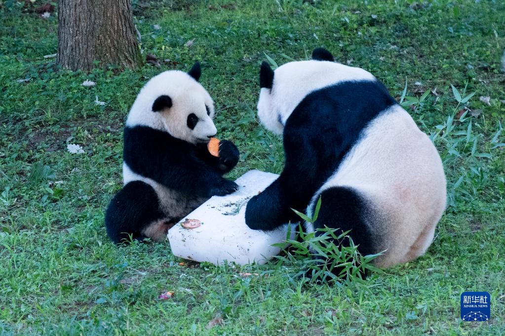 8月21日,在美国华盛顿史密森学会国家动物园,大熊猫“小奇迹”(左)和妈妈“美香”享用水果冰蛋糕。