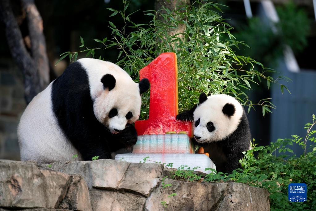 8月21日,在美国华盛顿史密森学会国家动物园,大熊猫“小奇迹”(右)和妈妈“美香”一起享用水果冰蛋糕。给“小奇迹”特制的大蛋糕上面插着一根红色蜡烛形状的“1”,是葡萄苹果汁稀释后冰冻而成的。