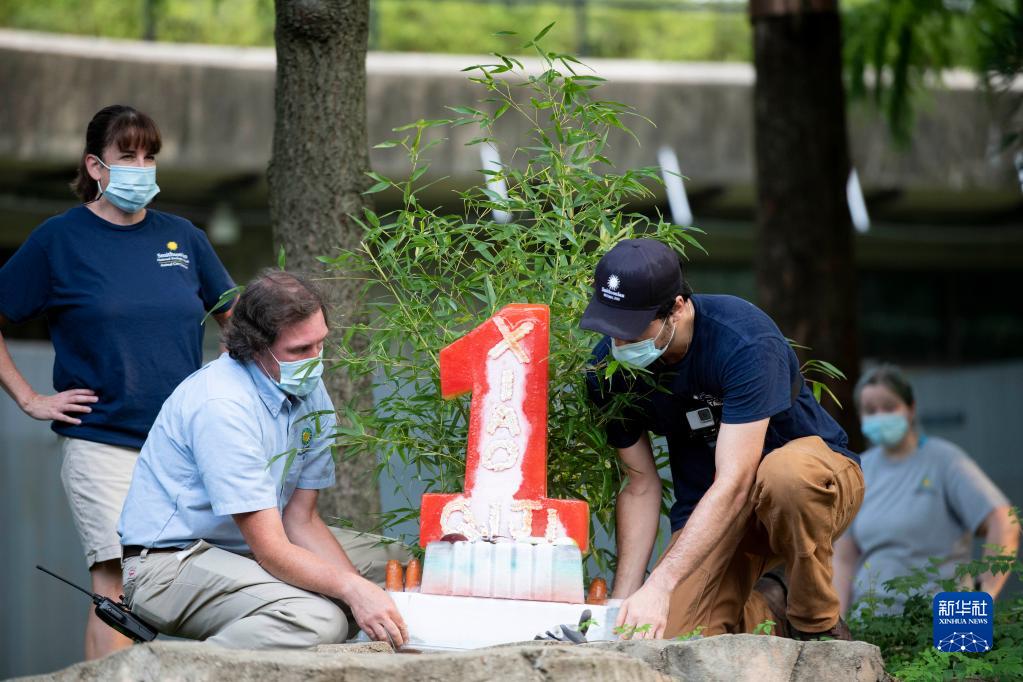 8月21日,美国华盛顿史密森学会国家动物园的工作人员为大熊猫“小奇迹”准备水果冰蛋糕。给“小奇迹”特制的大蛋糕上面插着一根红色蜡烛形状的“1”,是葡萄苹果汁稀释后冰冻而成的。