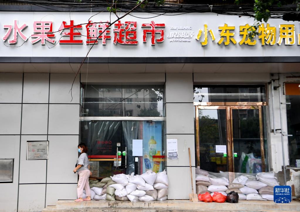 8月22日,郑州市二七区一家临街商铺门口堆满沙袋。