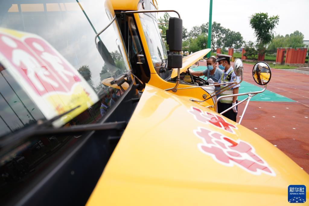 8月22日,在河北邢台经济开发区一幼儿园,河北省邢台市公安交警支队开发区大队民警对校车进行安全检查。