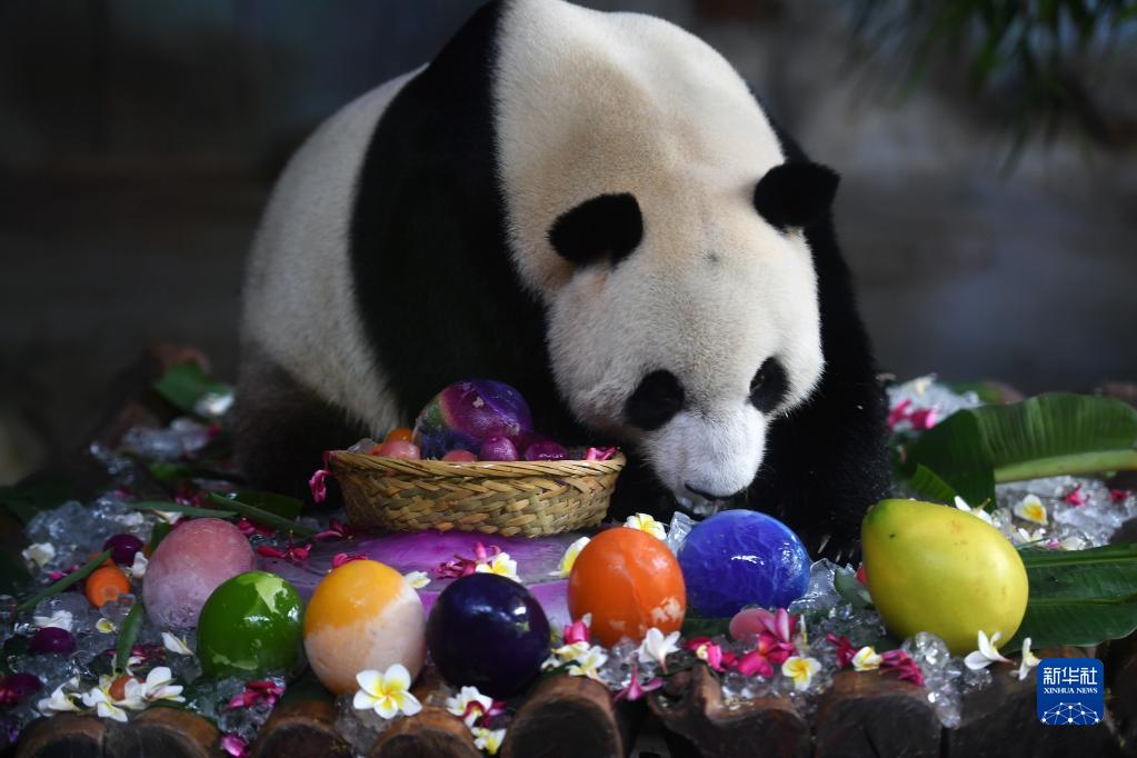 当日,位于海口市的海南热带野生动植物园为园内大熊猫“贡贡”和“舜舜”举行8岁生日庆祝活动。工作人员用冰块、竹笋、水果、窝窝头等食物做成生日蛋糕等美食,为它们庆生。