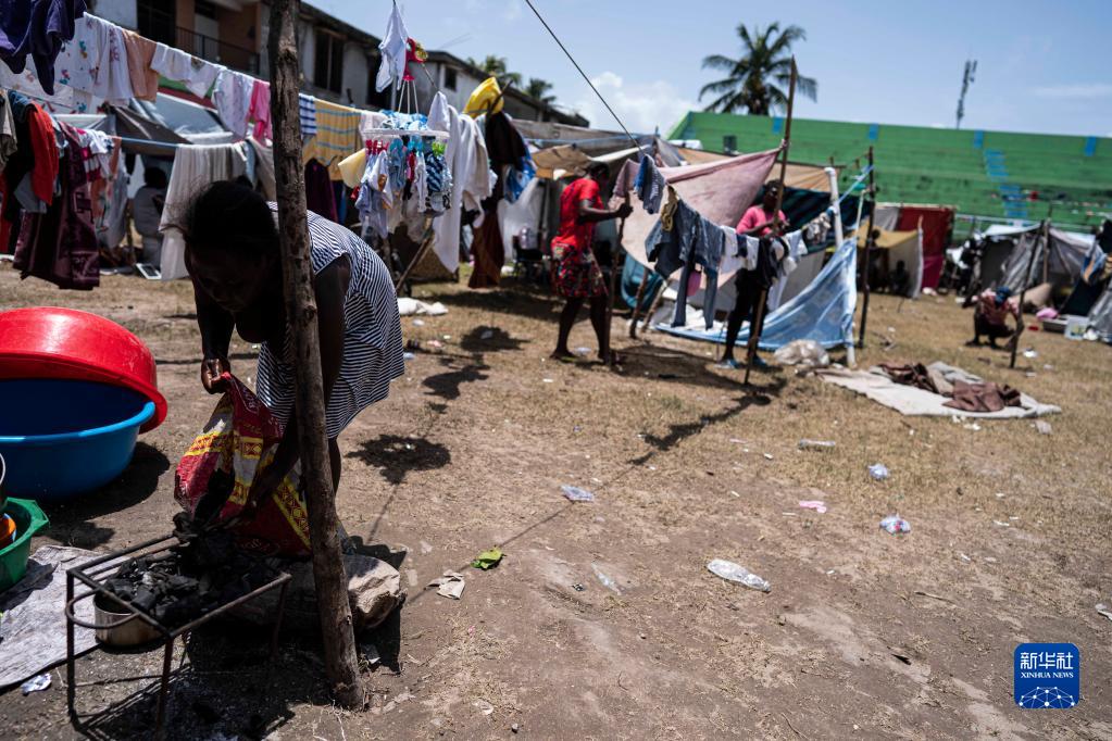8月21日,人们在海地莱凯用作临时避难所的体育场内晾晒衣服。