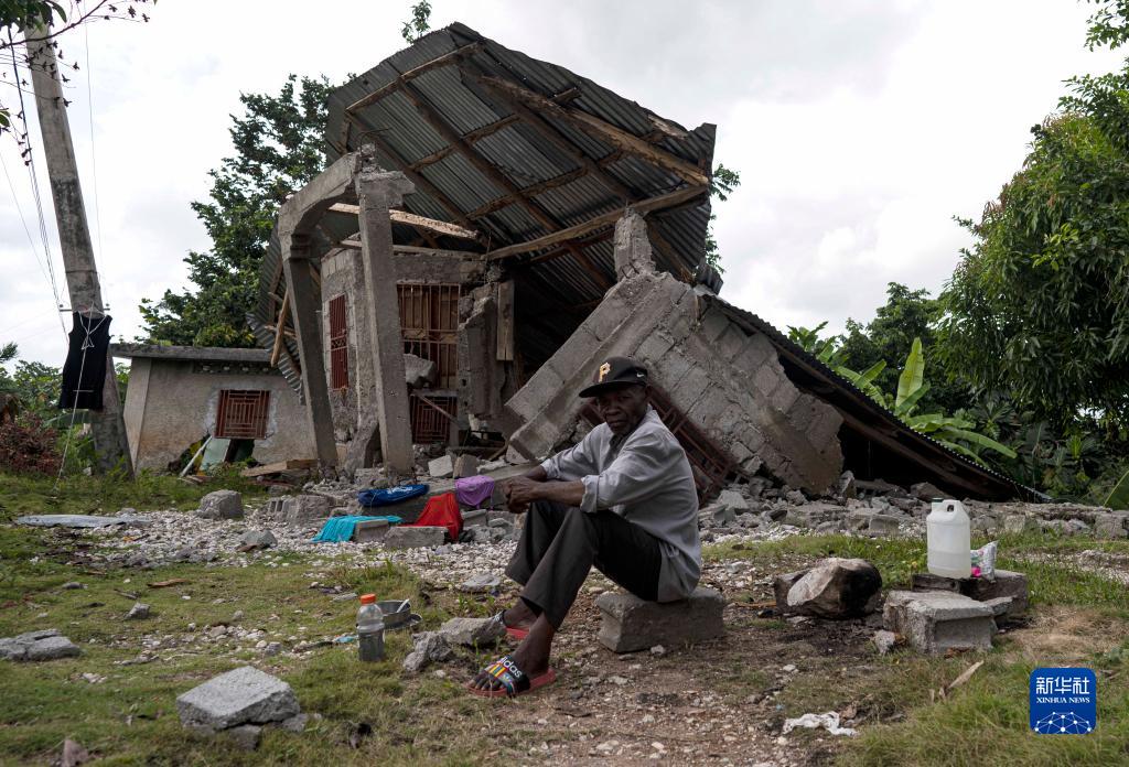 8月21日,在海地莱凯附近的马瑟林,一名男子坐在一座在地震中损毁的房屋前。