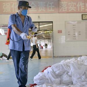 8月23日,北京客运段洗涤车间的工作人员在进行洗涤前卧具防疫消杀工作。