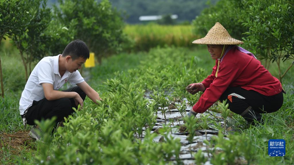 8月13日,在位于广西融安县长安镇大坡村的“蚂蚁农业电商数字示范基地”内,韦小东(左)在查看金桔苗。
