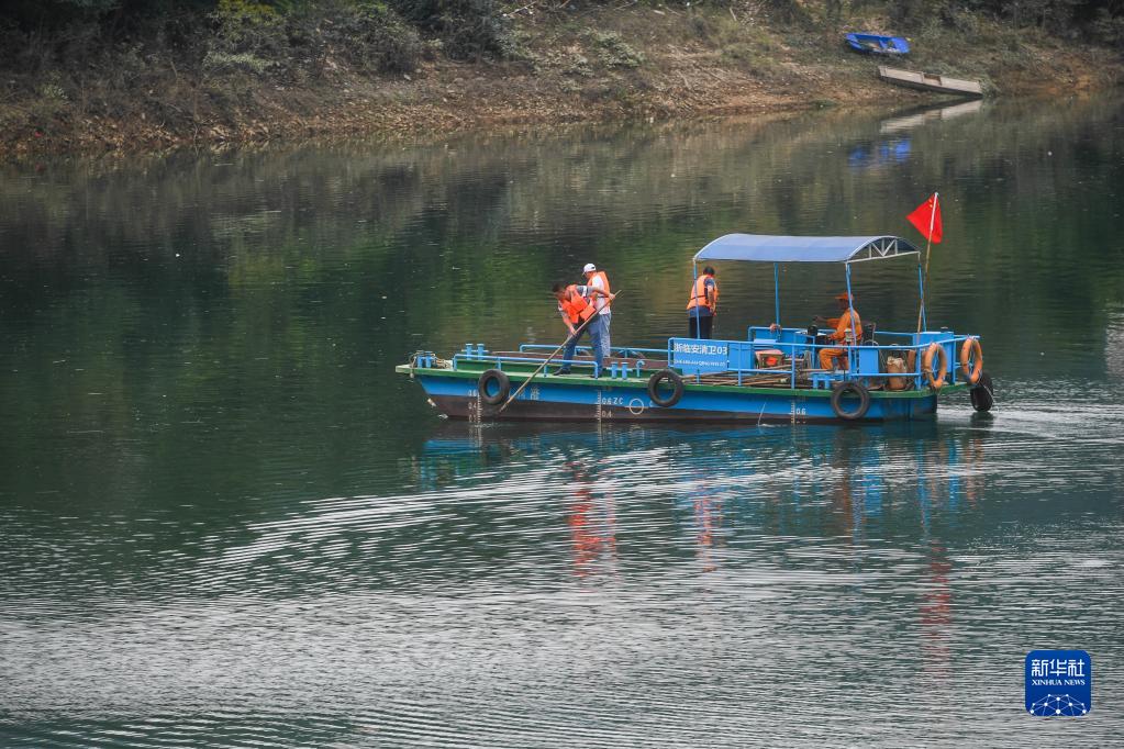 8月24日,浙江省杭州市临安区龙岗镇的党员志愿者在华光潭水库乘船打捞库面漂浮物。华光潭水库库容8000多万立方米,是当地饮用水水源保护区。