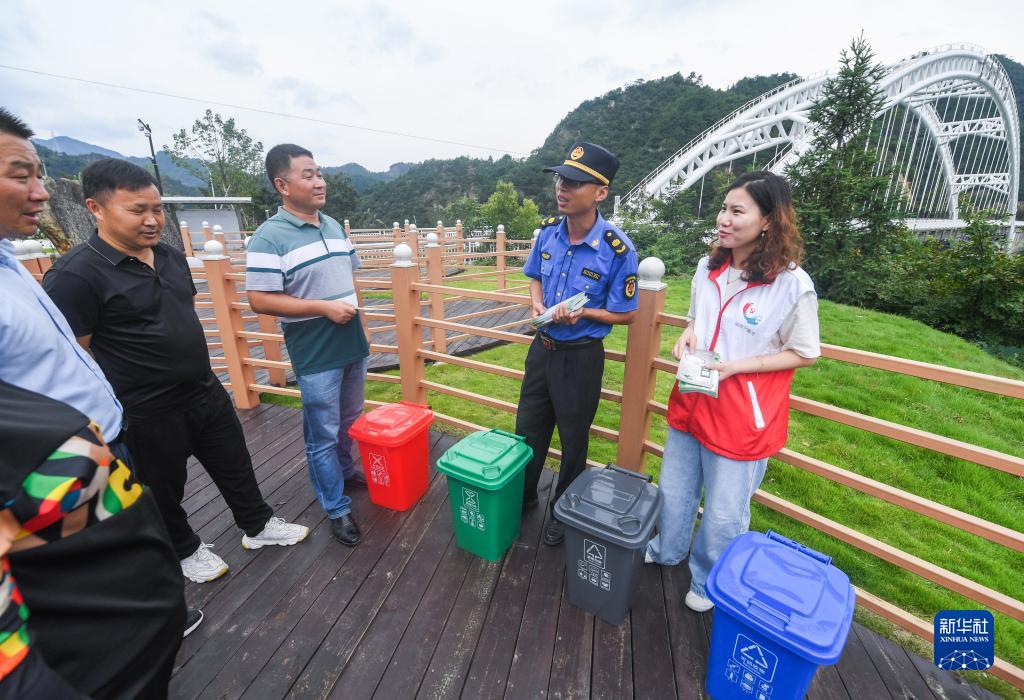 8月24日,党员志愿者和城管执法工作人员给龙岗镇水源保护区内的村民普及垃圾分类知识。