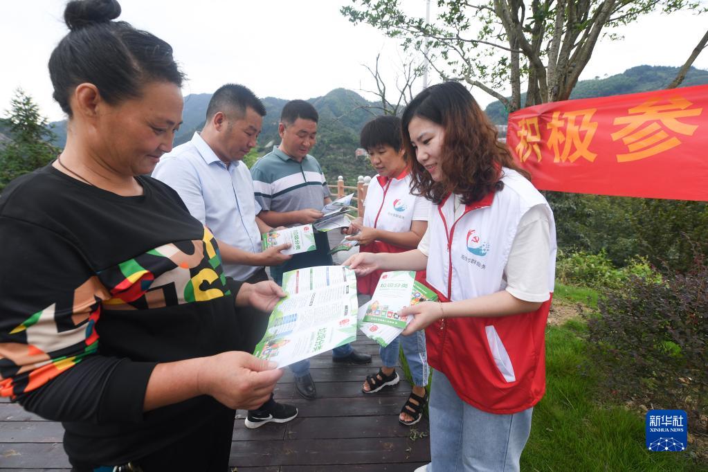 8月24日,党员志愿者给龙岗镇水源保护区内的村民分发垃圾分类知识宣传册。