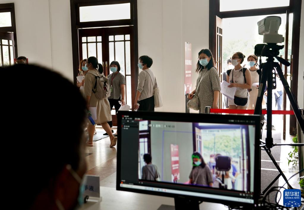 8月24日,在华东师范大学,参加演练的人员进入教学楼时接受测温。