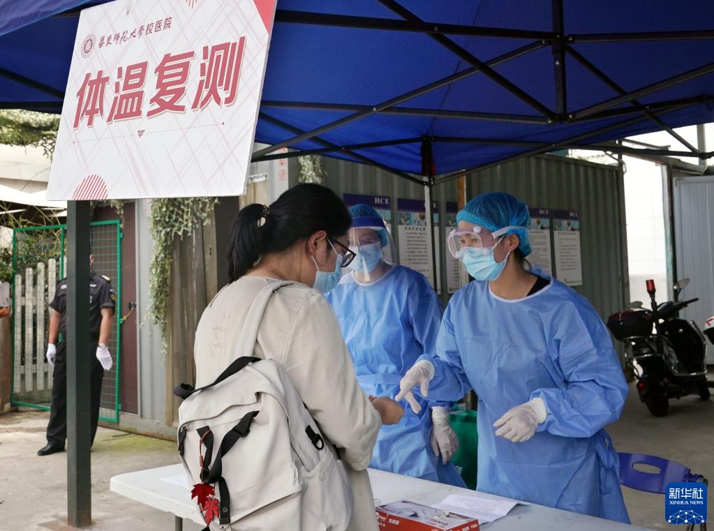 8月24日,在华东师范大学门口,参加演练的防疫人员对“体温异常人员”进行体温复测和流调登记。