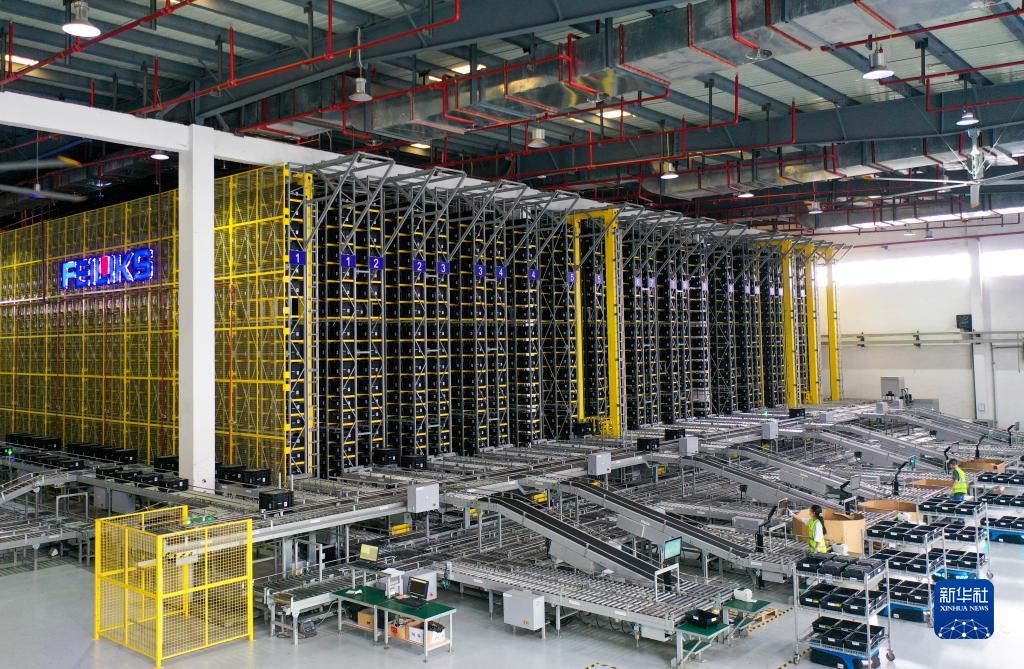 8月24日,在重庆飞力达供应链管理有限公司的自动化立体仓库内,数台工业机器人在货架上快速取放货物(无人机照片)。