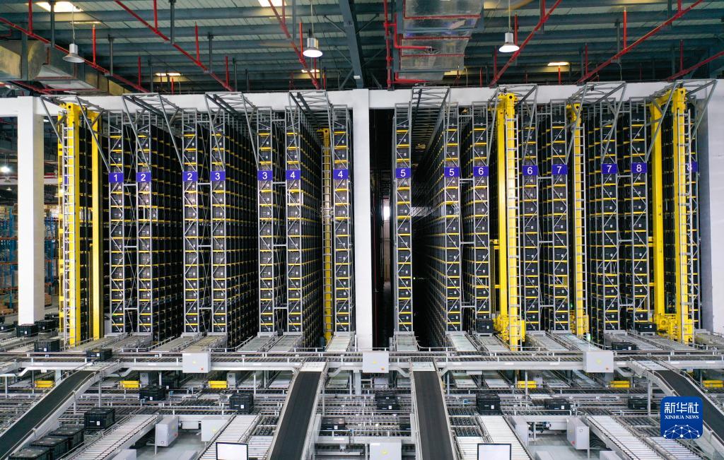 8月24日,在重庆飞力达供应链管理有限公司的自动化立体仓库内,数台工业机器人在货架上快速取放货物(无人机照片)。