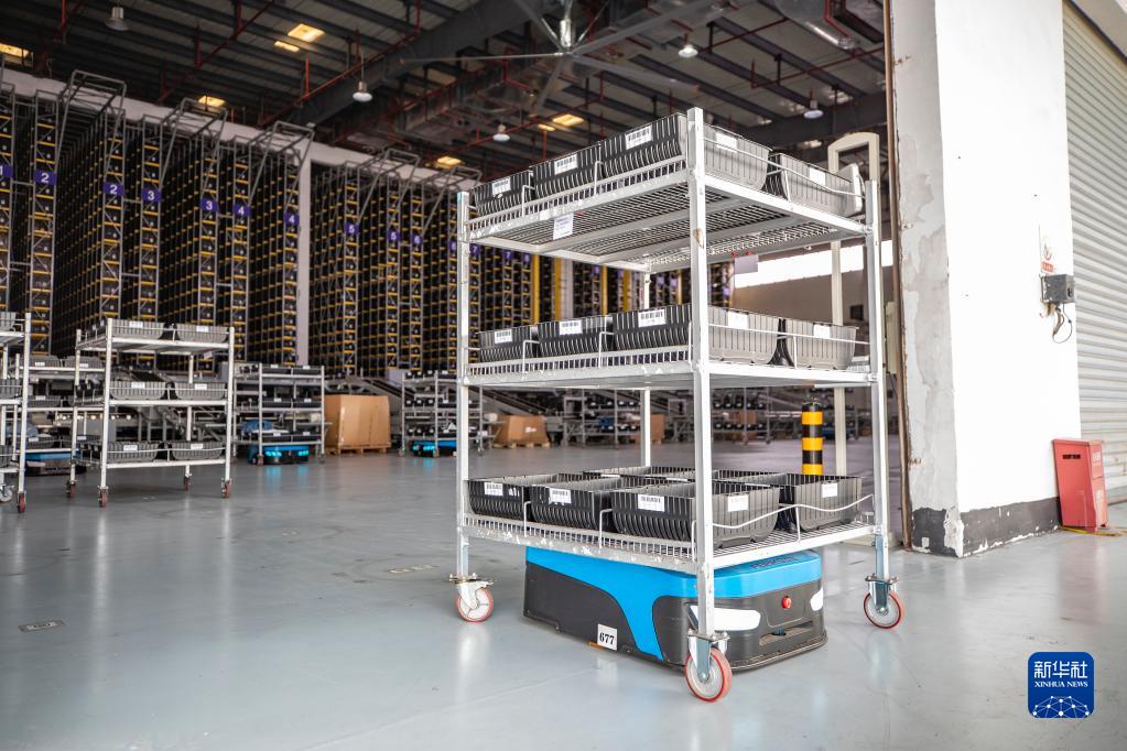 8月24日,在重庆飞力达供应链管理有限公司,自动导航车从自动化立体仓库内将需要出库的货物搬运到自动驾驶货车上。