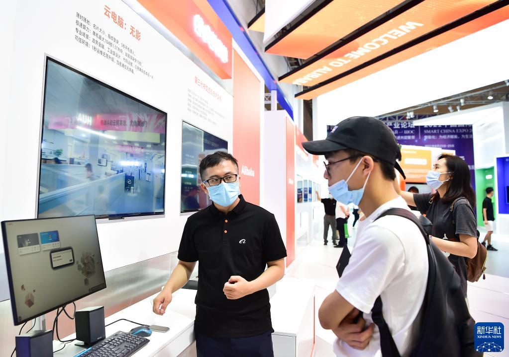 8月24日,2021智博会阿里巴巴展厅的工作人员(左)向观众介绍“无影”云电脑。