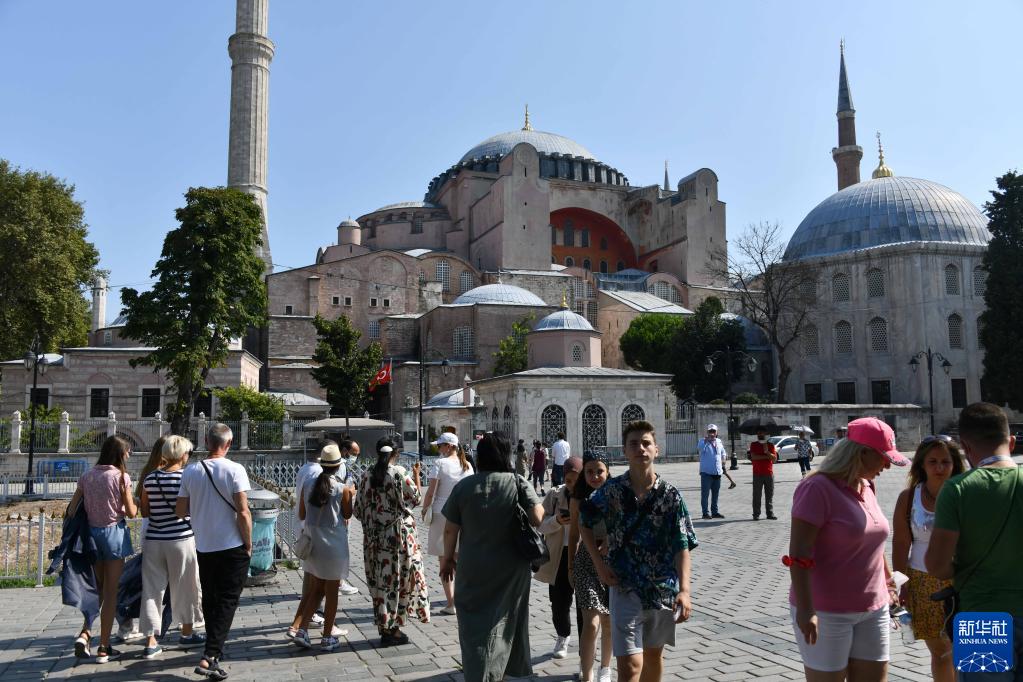 8月24日,游客在土耳其伊斯坦布尔的圣索菲亚大教堂附近观光游览。