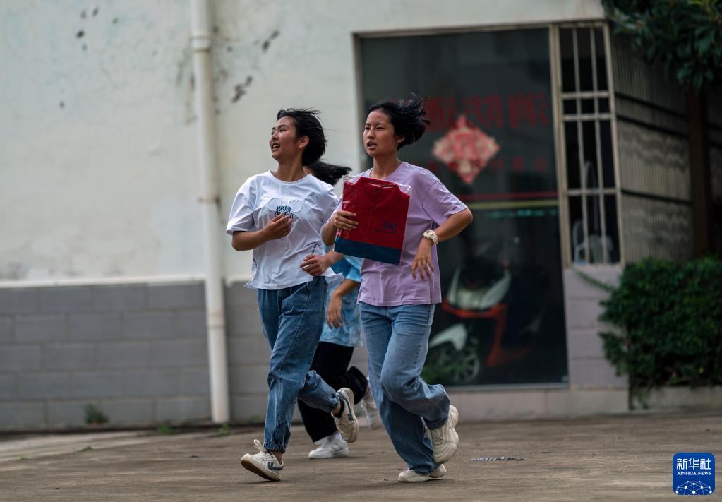 杨丽梅(左)与同学跑步回宿舍(8月23日摄)。