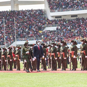 8月24日,哈凯恩德·希奇莱马在赞比亚首都卢萨卡举行的就职仪式上检阅仪仗队。