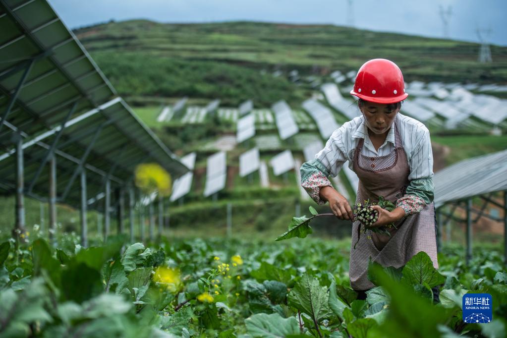 在贵州省毕节市威宁彝族回族苗族自治县,光伏板下5000多亩土地种植的农产品进入丰收季,食用菌、红菜苔、白萝卜……一片片光伏板下生机盎然。