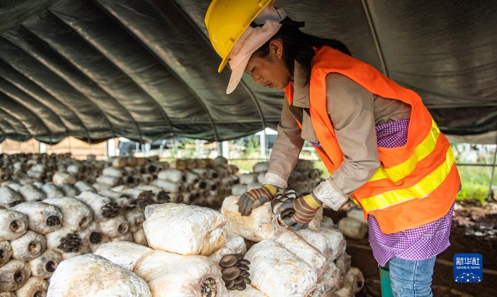 当地村民在夏家坪子光伏发电设施下的大棚内采摘食用菌(8月24日摄)。