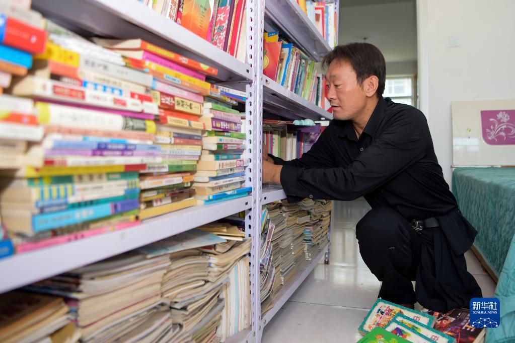 8月24日,巴特尔在家中的爱心书屋整理图书。
