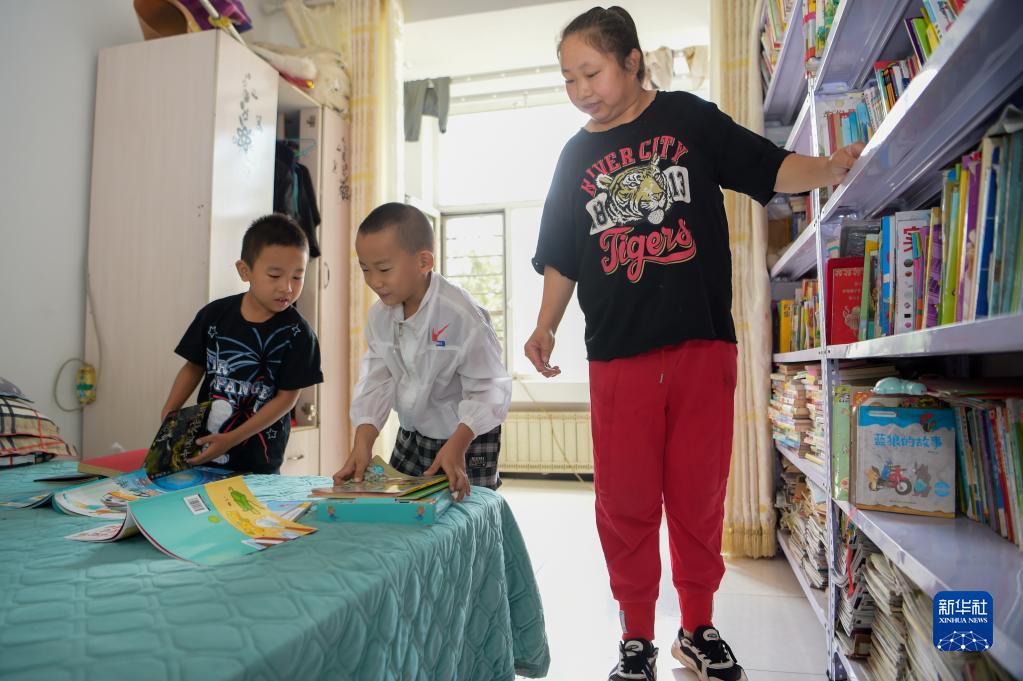 8月24日,尚玉会与小朋友一起在家中的爱心书屋查找图书。新华社记者 李志鹏 摄