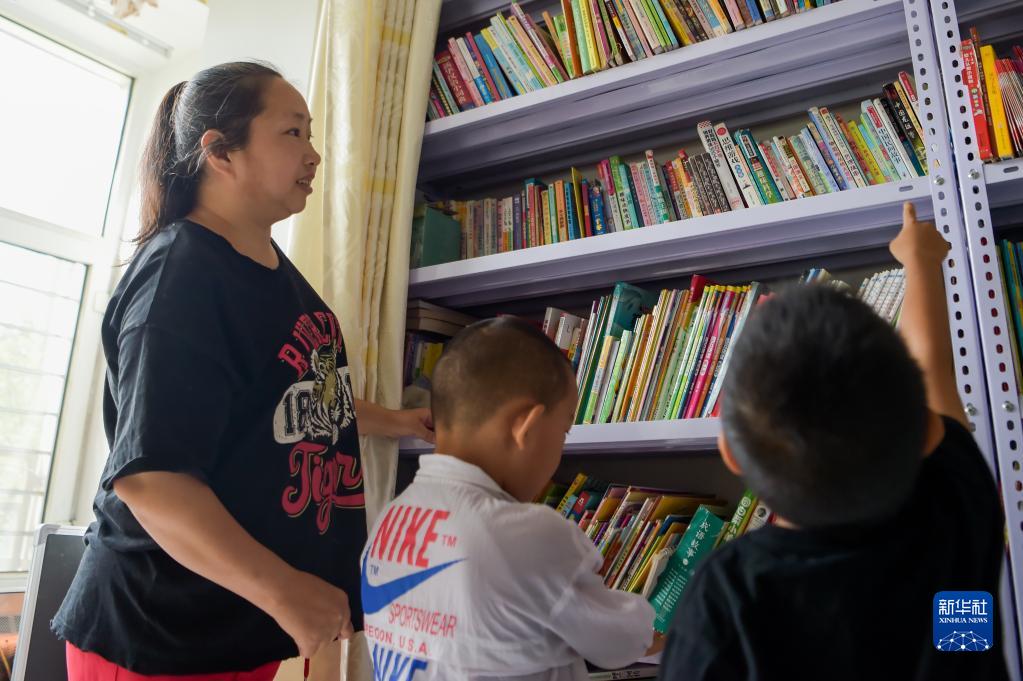 8月24日,尚玉会与小朋友一起在家中的爱心书屋查找图书。新华社记者 李志鹏 摄
