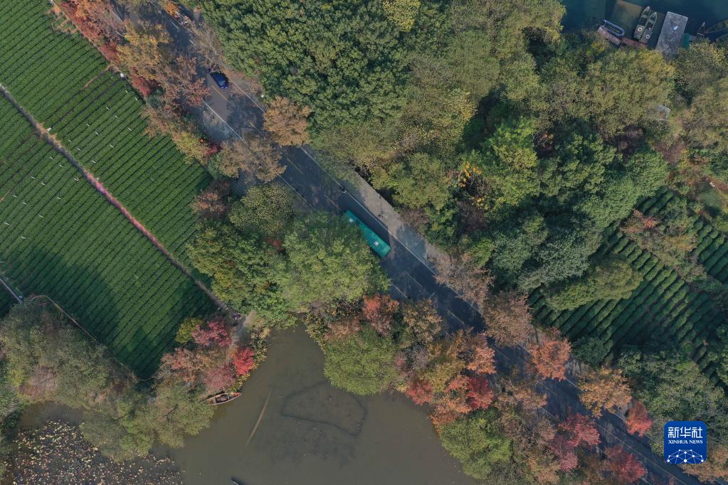 一辆纯电动公交车行驶在杭州西湖景区的龙井路上(2019年11月21日摄,无人机照片)。新华社记者 黄宗治 摄