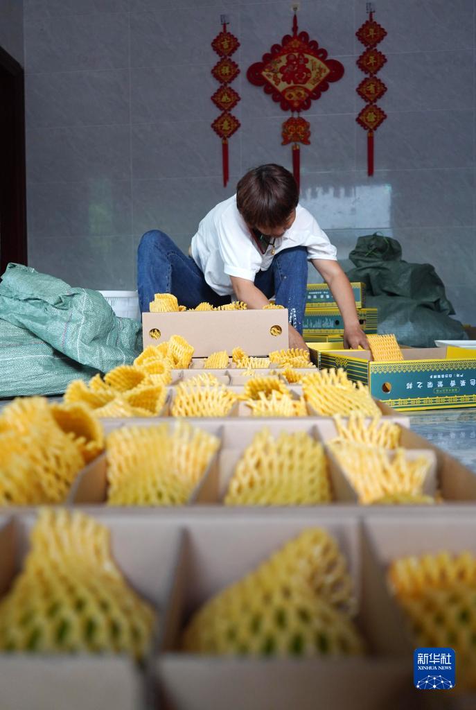 农村电商经营者把收购来的牛油果装箱,准备发货(8月17日摄)。