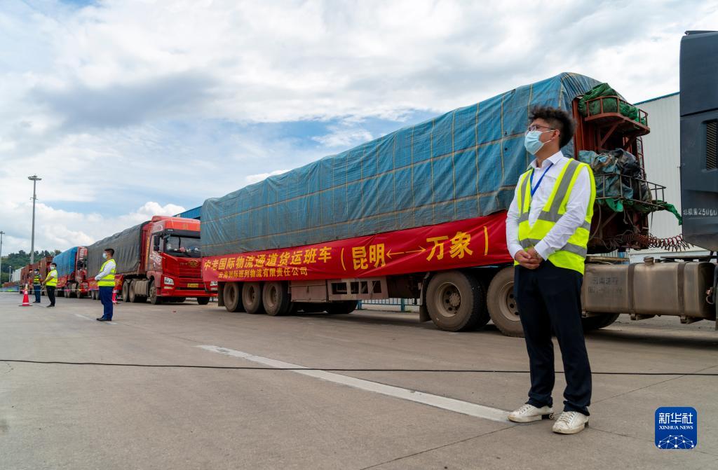8月25日,在昆明市经开区中铁集装箱昆明中心站,中老国际物流通道货运班车等待发车。新华社记者 陈欣波 摄