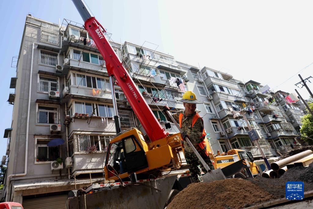 8月25日,工人在合肥市瑶海区一老旧小区改造升级现场施工。新华社发(解琛 摄)